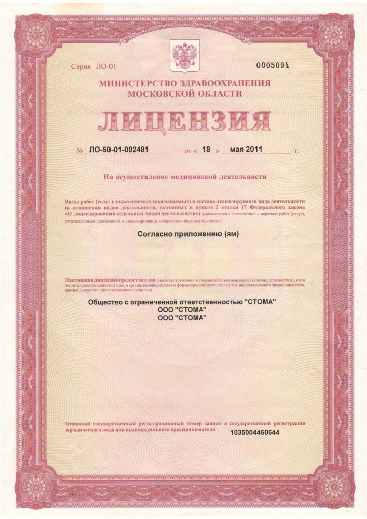 ООО "СТОМА" ИНН 5024057630 , КПП 502401001 , ОГРН 1035004460644